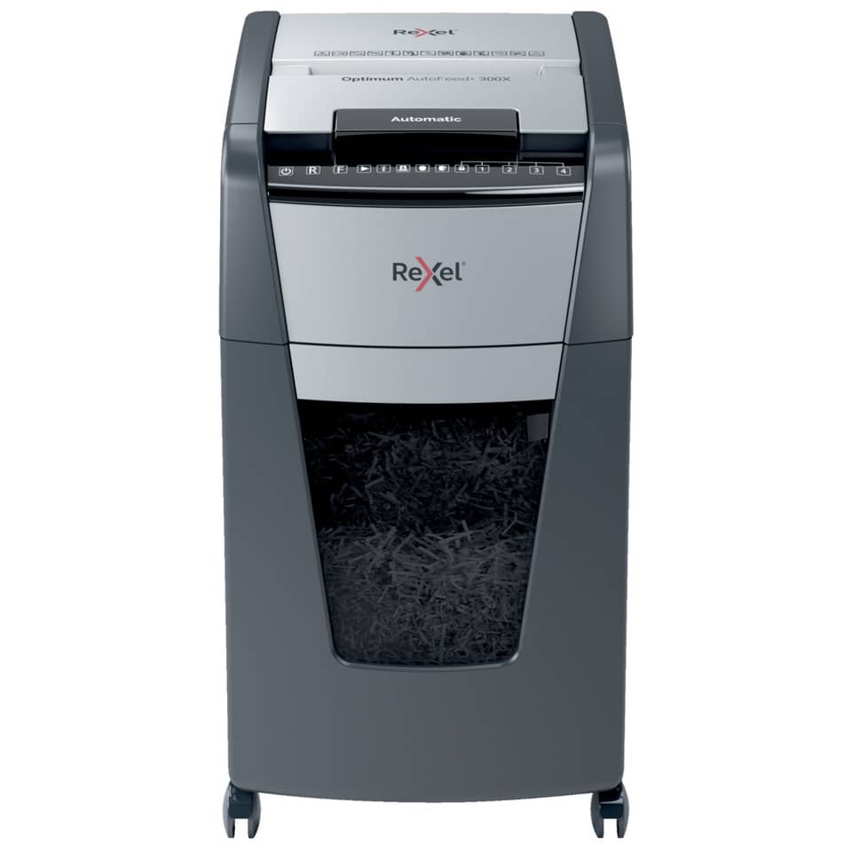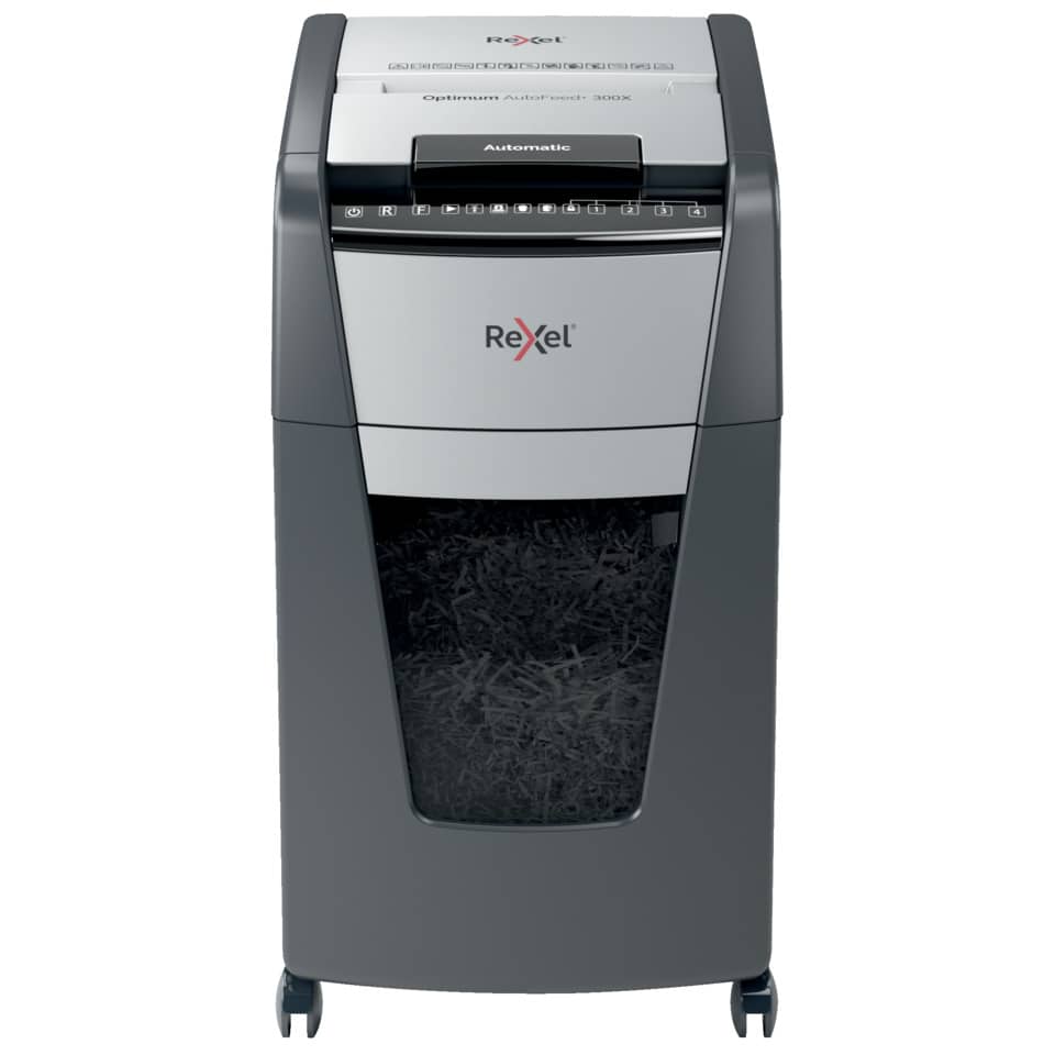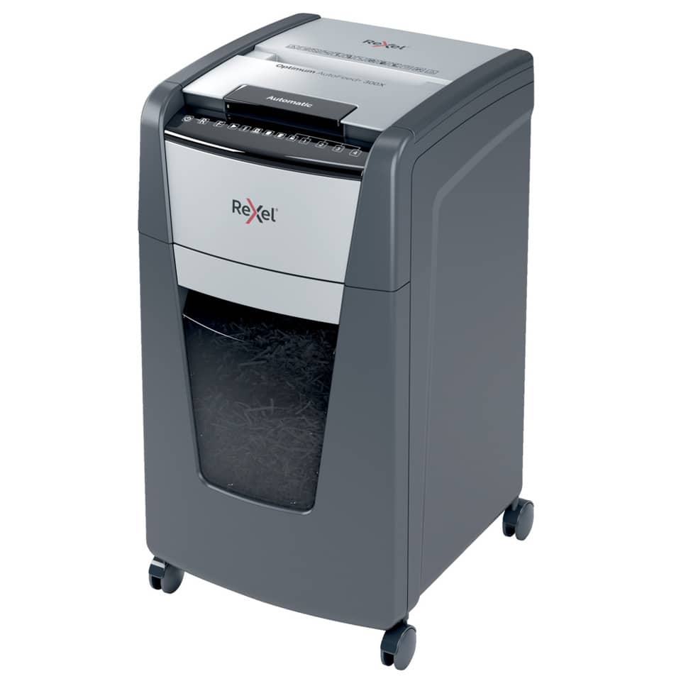 Distruggidocumenti Optimum AutoFeed+ 300X EU Rexel taglio a frammenti 4×26 mm DIN P-4 – 60 litri – Nero