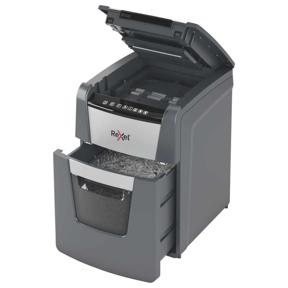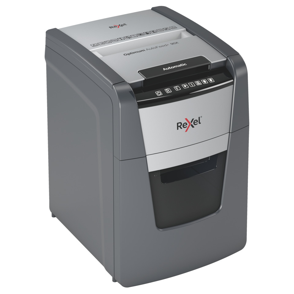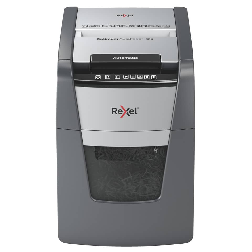 Distruggidocumenti Optimum AutoFeed+ 90X EU Rexel taglio a frammenti 4×28 mm DIN P-4 – 34 litri – Nero