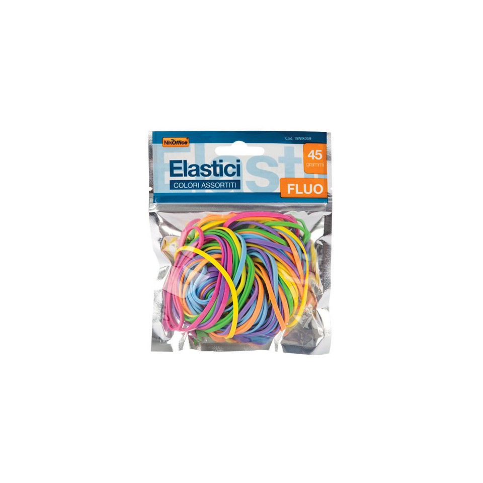 Elastici in gomma e lattice Nikoffice in busta da 45 g (circa 70 elastici). Diametro elastici assortito. Colori fluo assortiti.