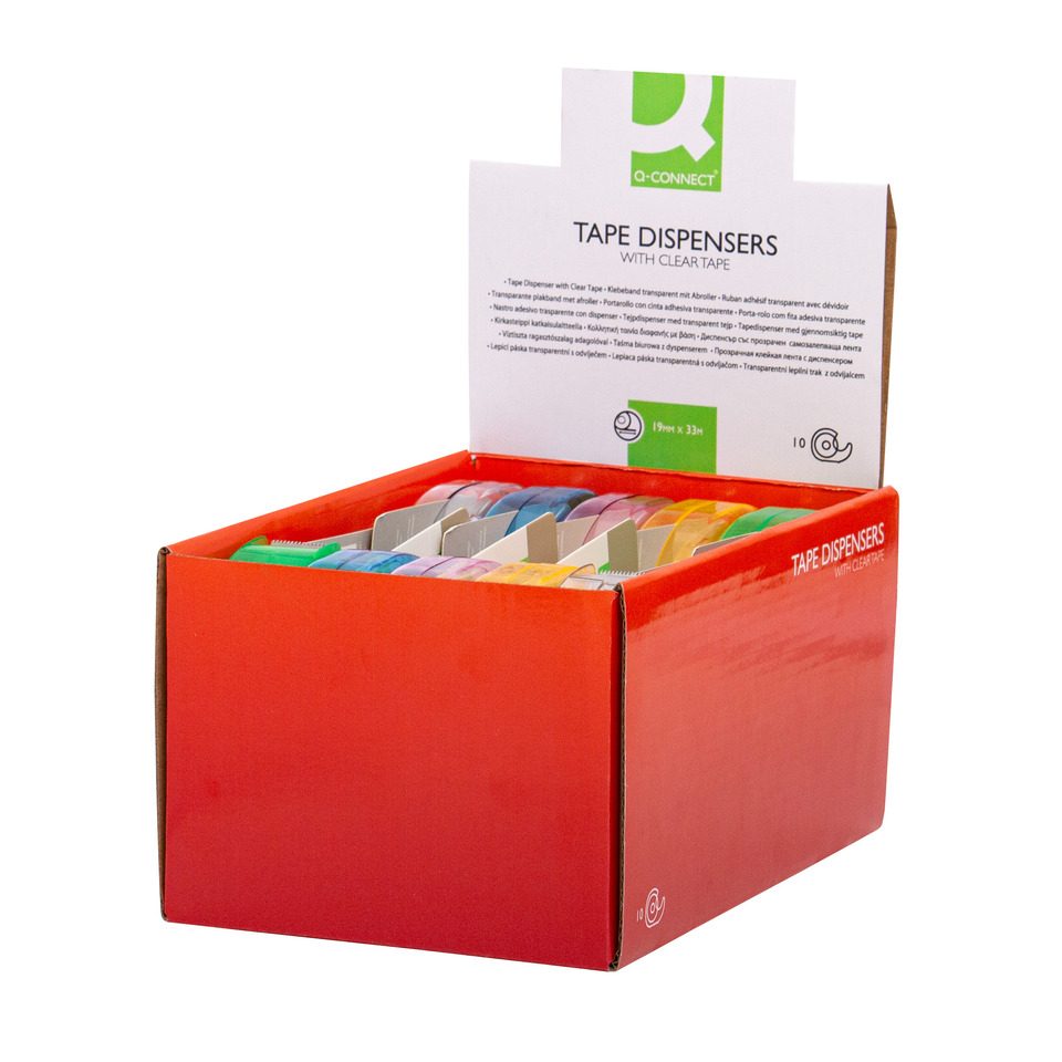 Espositore composto da 10 nastri adesivi trasparenti con dispenser a chiocciola blisterati singolarmente. Nastro nel formato 19 mm x 33 m. Disponibili in colori assortiti.