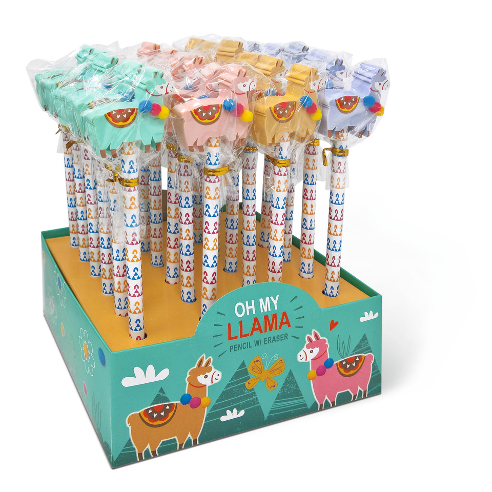 Display 24 matite con top in gomma fantasia Lama. Colori assortiti.