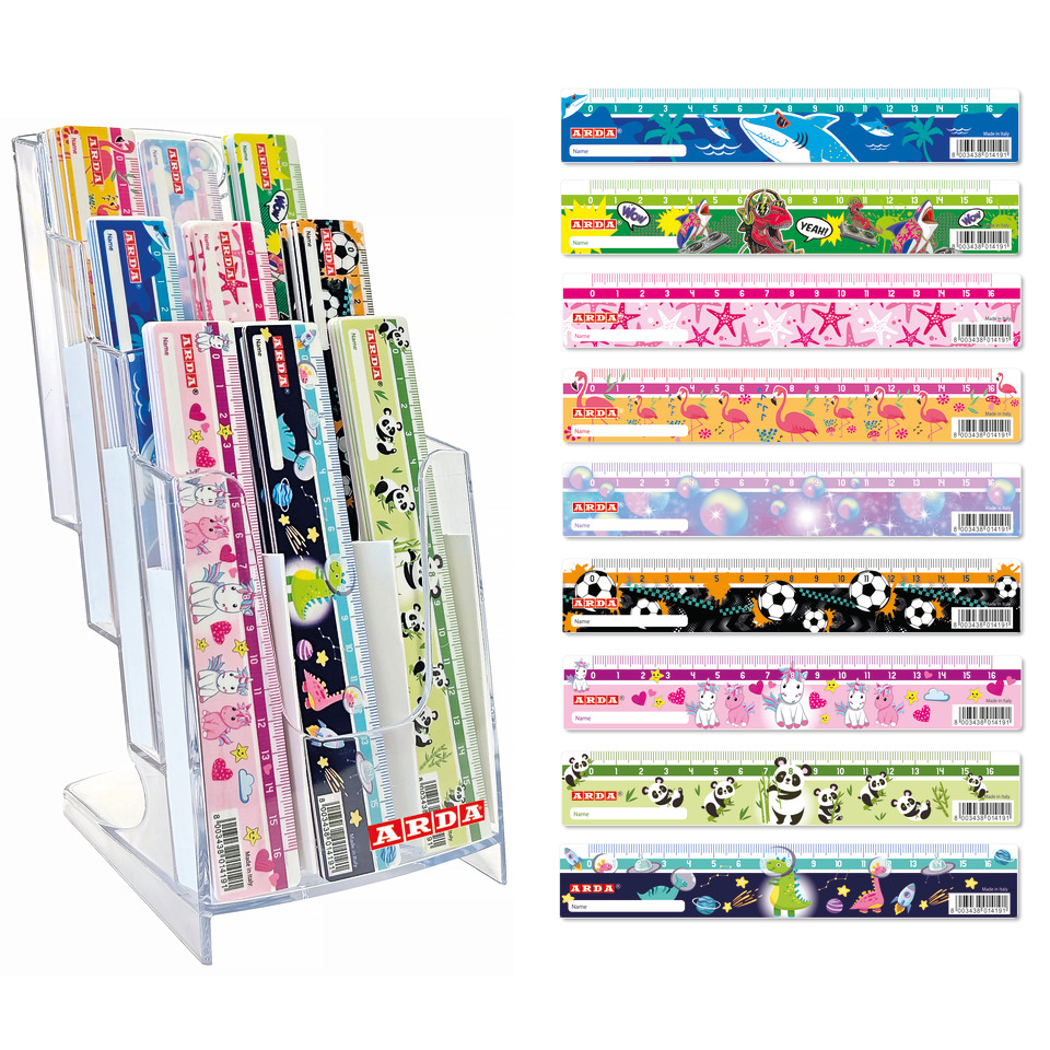 Espositore composto da 45 righelli lunghi 16 cm con decori fantasy assortiti . I righelli hanno smusso e bordo tirachina. La millimetratura e il decoro sono in digitale.