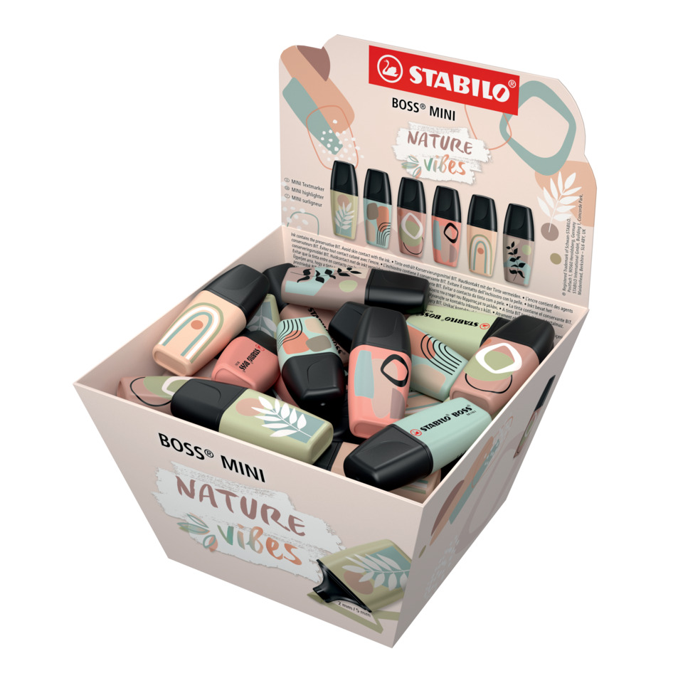 Espositore in cartone composto da 50 evidenziatori Stabilo Boss Mini NatureVibes. Dotati di inchiostro universale e punta a scalpello con tratto da 2 e 5 mm. Resiste 4 ore senza cappuccio grazie alla tecnologia Anti-Dry-Out. Realizzati in colori delicati ed avvolgenti ispirati alla natura. Disponibili in colori assortiti: 6 pezzi cenere; 7 pezzi fava di cacao e foglia di tè; 10 pezzi terra di Siena, verde oliva e sabbia.