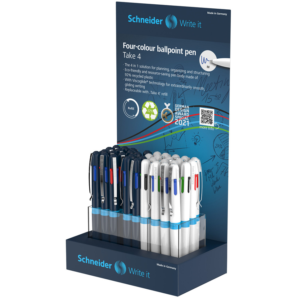 Penna a sfera a quattro colori con inchiostro Viscoglide®. La confezione promozionale comprende 2 espositori: 1 per le penne Take 4 standard e 1 per le penne Take 4 Neon. L'assortimento delle Take 4 standard (colori inchiostro rosso, blu, nero e verde) è così composto: 36 pezzi suddivisi in 18 con fusto blu scuro-ciano e 18 con fusto bianco-ciano. L'assortimento delle Take 4 Neon (colori inchiostro nero, blu, giallo brillante, utile per evidenziare, e un colore neon in base al colore del fusto: arancione, rosa e verde chiaro) è così composto: 36 pezzi suddivisi in 9 per colore (giallo, verde, arancione e rosa).