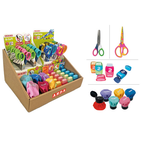Espositore da banco composto da 62 articoli di cancelleria. Assortimento: 20 forbici Bi-Soft da 13 cm sfuse, 20 forbici Fantasy da 15 cm sfuse, 6 temperamatite Tenks Classic e 16 temperamatite 2Gether.