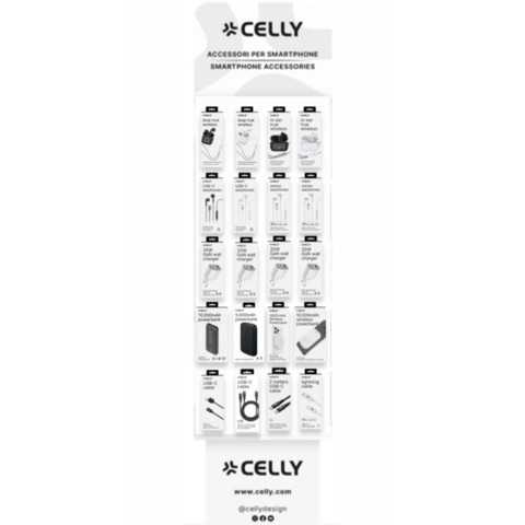 Espositore da terra in cartotecnica Celly, composto da 60 accessori per l'audio, la ricarica e cavetteria. Prodotti Audio: 21 auricolari tra modelli wireless e con cavo (6 true Wireless drop con versione bluetooth 5.3, di cui 3 neri e 3 bianchi: design compatto, tecnologia touch, tempo di riproduzione 4 ore, tempo in stand by 30 ore, microfoni integrati in entrambi gli auricolari, cavo USB-C incluso; 6 auricolari true wireless in-ear con versione bluetooth 5.3, di cui 3 neri e 3 bianchi: tempo di ricarica 1,5 ore, tempo di utilizzo 5 ore, tempo in stand by 50 ore, funzione ANC e ENC, Microfoni incorporati, ricarica wireless; 6 auricolari con filo UP1100 USB-C (3 neri e 3 bianchi: lunghezza cavo 1,2 mt, controllo volume e microfono integrato); 3 auricolari con cavo Lightining (certificazione Made For iPhone, microfono integrato, tasto di risposta, remote control, lunghezza cavo 1,2 metri). Ricarica e cavi: 12 caricatori portatili (3 caricatori portatili USB-C da 25W e 3 DA 45W, 3 caricatori portatili da 25W con uscita USB-C e USB-A, 3 caricatori portatili da 20 W con porta USB-C e cavo da USB-C a Lightning), 15 cavi connettori (3 cavi connettori da 15W da USB-A a USB-C, lunghezza cavo 1 metro; 3 cavi connettori con potenza massima da 100w, dotati di un ingresso USB-C che si divide in Due connettori USB-C, lunghezza cavo 1,3 m; 3 cavi connettori con potenza massima 100W, con porte da USB-C a USB-C, lunghezza cavo 2 metri; 3 cavi connettori Power Delivery, potenza massima 60W, Connettore USB-C a USB-C, lunghezza cavo 1 metro; 3 cavi connettori Lightning da 60W con certificazione ''made for iPhone'', Lunghezza cavo 1 metro) e 12 powerbank energy da 10W (3 da 10000 mAh con porte USB con output totale di 2 Ampere/ 10 Watt per la ricarica dei dispositivi, di un connettore Micro Usb per la ricarica del Power Bank e di un connettore USB-C che fa sia da Input che da Output; 3 modelli da 5000 mAh con porta input/output USB-C, per ricaricare il powerbank e caricare i dispositivi, e una porta USB-A, oltre a degli indicatori LED; 3 powerbank circle wireless magnetici Magsafe da 3000 mAh compatibili con Android e cellulari dotati di tecnologia Magsafe e 3 powerbank da 5000 mAh per i nuovi i-phone dal 12 in poi, dotato di una porta di ingresso/uscita USB-C, questo powerbank può anche caricare il dispositivo tramite cavo USB-C).