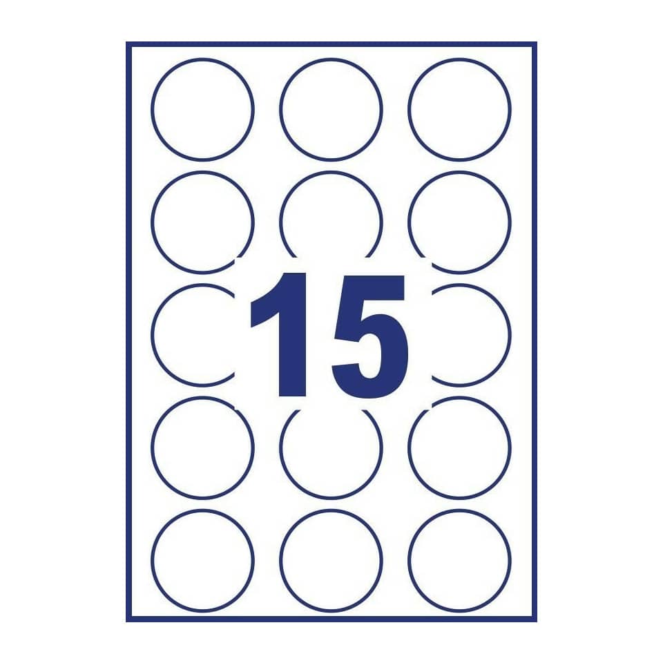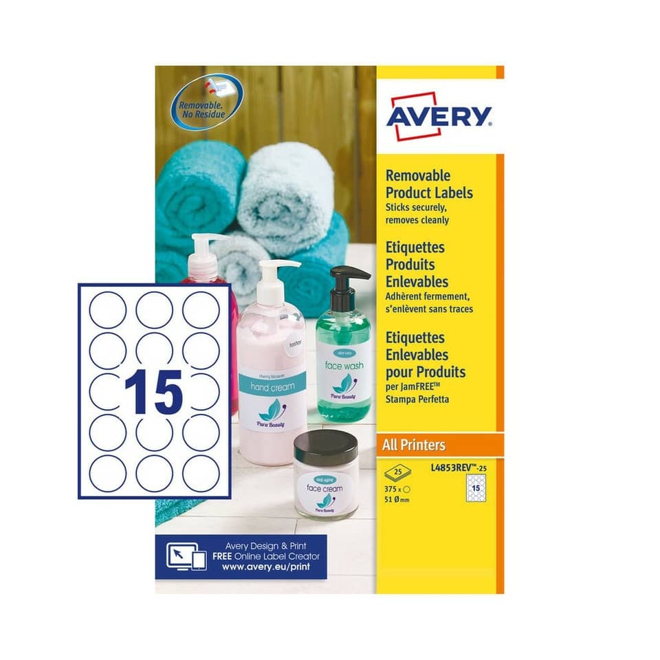 Etichette adesive rotonde rimovibili Bianche Avery Ø51 mm stampanti laser e Ink-jet – 15 etichette per foglio – 25 fogli L4853REV-25 (374 etichette)