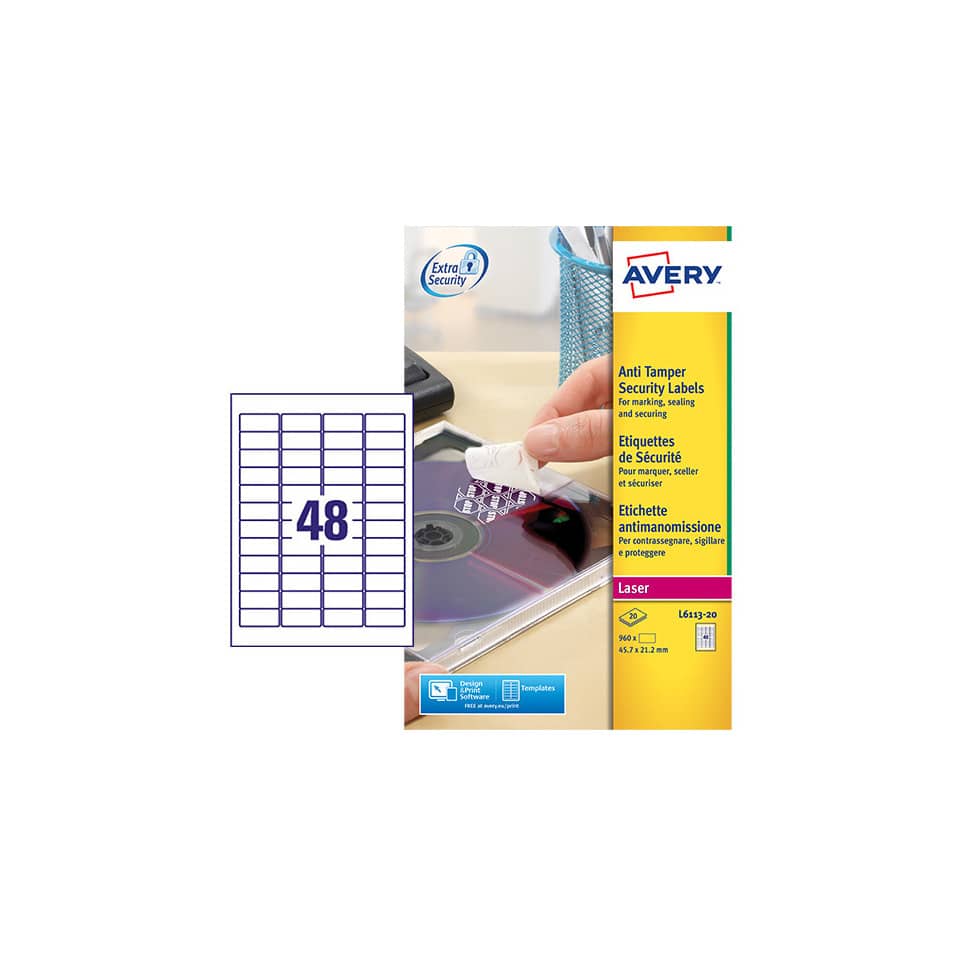 Etichette anti-manomissione Bianche per stampanti laser Avery in poliestere - 45,7x21,2 mm - 48 etichette per foglio - 20 fogli - L6113-20 (960 etichette)