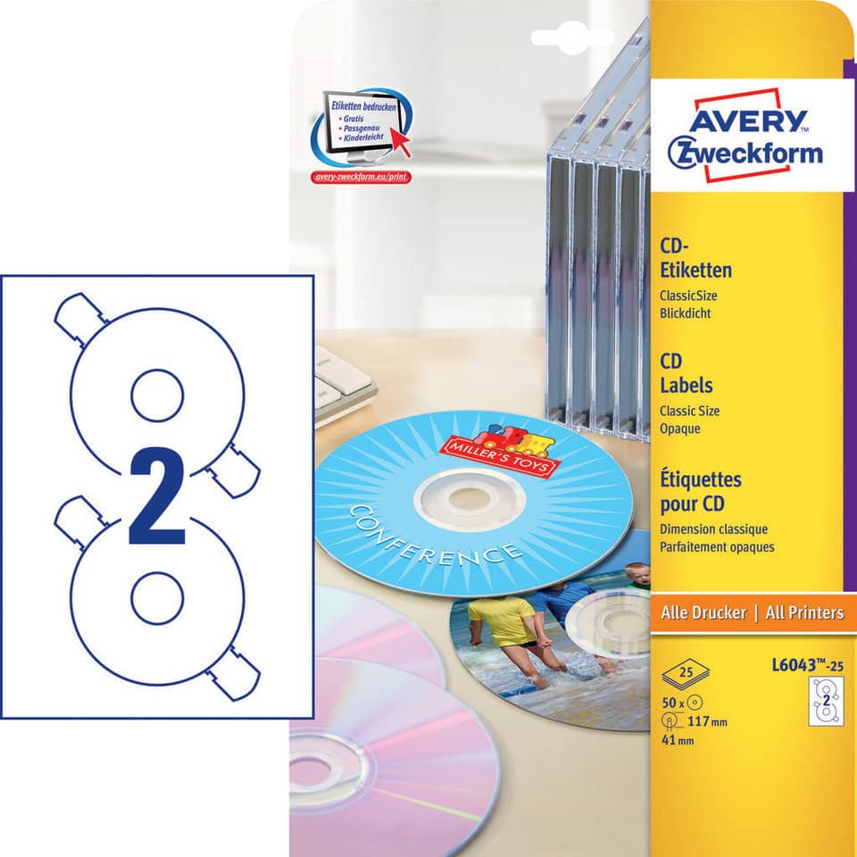 Etichette Classiche CD Avery per stampanti Laser ed Ink-jet - Bianco - Ø117 mm - 2 etichette per foglio - 25 fogli - L6043-25 (conf.50 etichette)