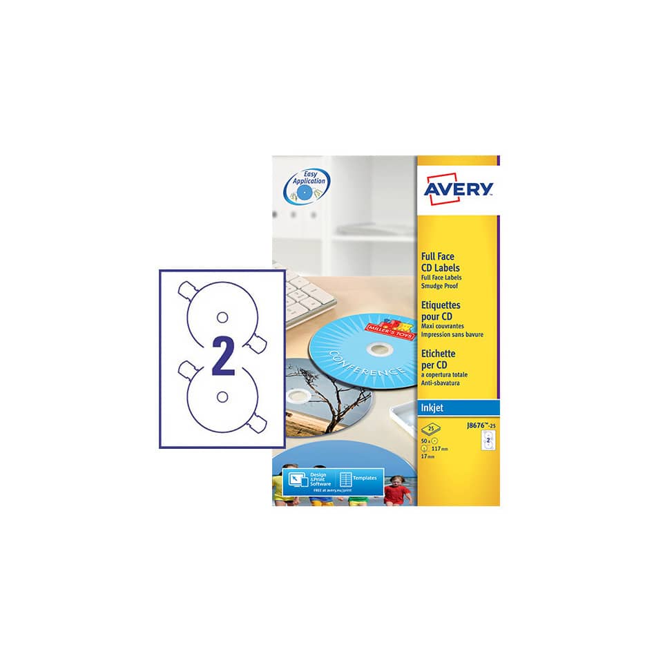 Etichette Full-Face CD Avery per stampanti Ink-jet - Bianco patinate opaco - Ø117 mm - etichette per foglio - 25 fogli - J8676-25 (conf.50 etichette)