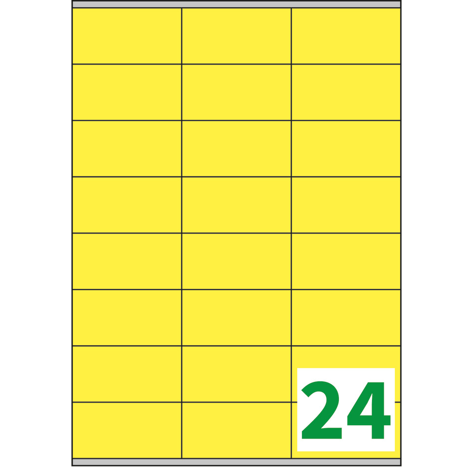 Etichette giallo fluorescente permanenti laser/inkjet. Dimensioni: 70 x 36 mm. N°24 etichette per foglio. Confezione da 100 +10 fogli OMAGGIO.