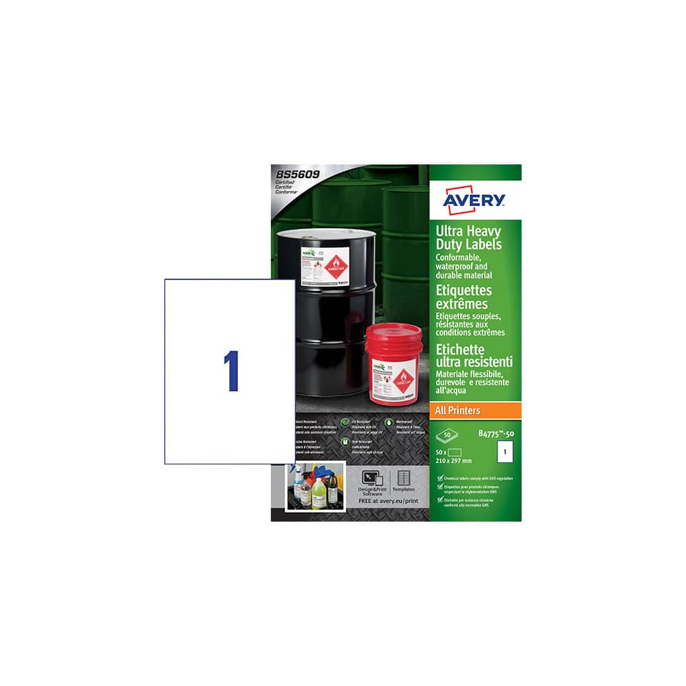 Etichette in Teslin Bianco Avery Laser/Inkjet 1 etichetta per foglio 210x297 mm - B4775-50 (conf.50 fogli)