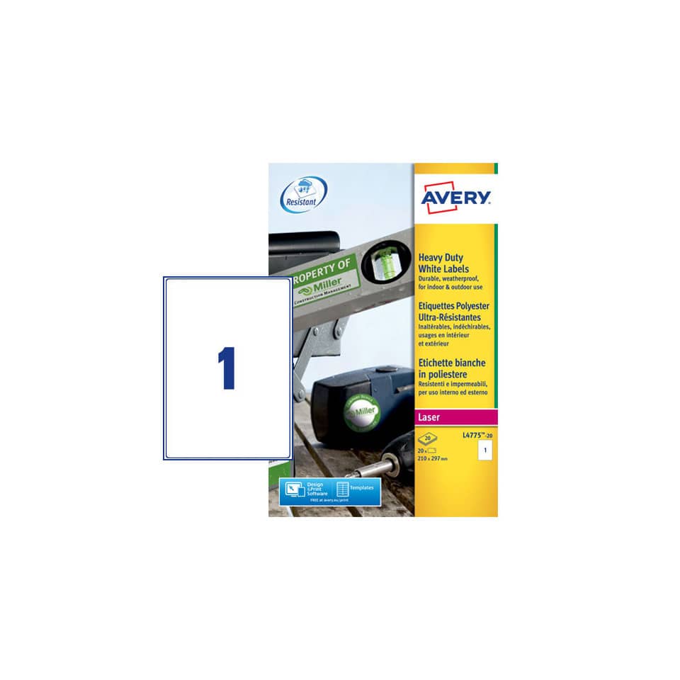 Etichette poliestere Bianche per stampanti laser Avery – 210×297 mm – 20 fogli (20 etichette)