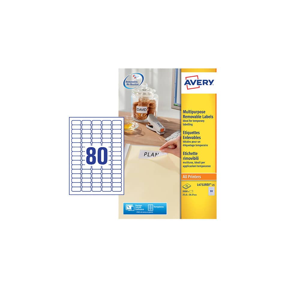 Le Etichette bianche rimovibili AVERY 35,6x16,9 mm sono progettate per offrire la massima compatibilità con diversi tipi di stampanti, tra cui stampanti laser e inkjet. La loro dimensione di 35,6x16,9 mm le rende perfette per la creazione di etichette indirizzo, etichette prodotto, etichette per raccoglitori e molto altro. Il materiale in cui sono realizzate garantisce una buona adesività, pur rimanendo rimovibili, evitando così di danneggiare le superfici a cui vengono applicate. Si tratta di vere e proprie soluzioni per l'organizzazione di uffici, magazzini, archivi e la gestione di spedizioni. La confezione contiene ben 80 etichette per foglio, offrendo un elevato rendimento. L'uso di questo prodotto consente di personalizzare e identificare facilmente oggetti e documenti, migliorando l'efficienza e l'organizzazione generale. L'articolo può essere utilizzato per creare etichette personalizzate con software dedicati, oppure direttamente dai programmi di elaborazione testi più comuni.