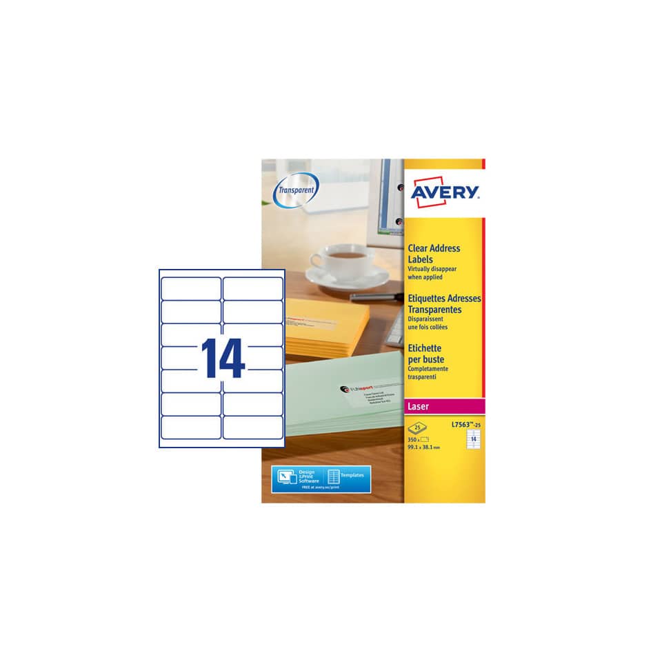 Etichette Trasparenti QuickPEEL™ Avery poliestere – Laser – 99,1×38,1 mm – 14 etichette per foglio – L7563-25 (conf.25 fogli)