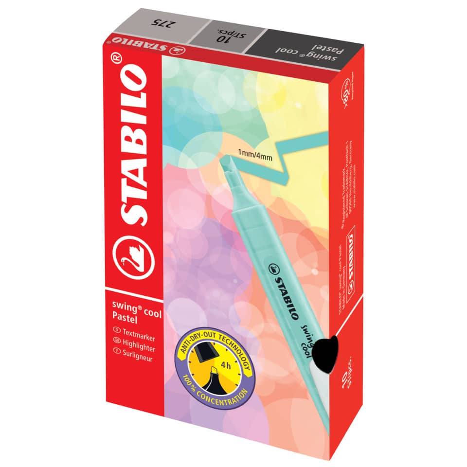 Evidenziatore a tampone con comoda clip ideale per ragazzi e studenti. Con la tecnologia STABILO Anti-Dry-Out resiste fino a 4 ore senza cappuccio. Doppia ampiezza tratto 1+4 mm. Colore azzurro ghiaccio.