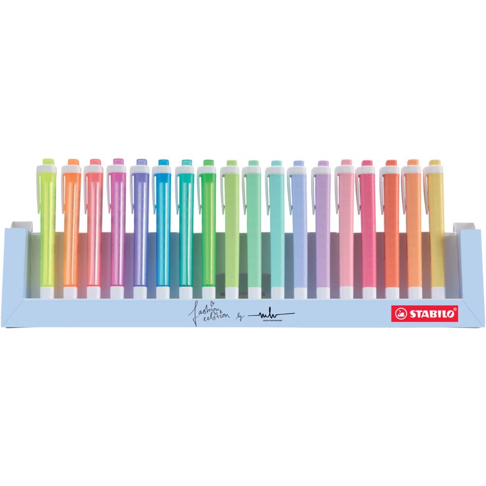 Evidenziatore a tampone con comoda clip ideale per ragazzi e studenti. Con la tecnologia Stabilo Anti-Dry-Out resiste fino a 4 ore senza cappuccio. Doppia ampiezza tratto 1+4 mm. Deskset composto da 18 pezzi, colori assortiti.