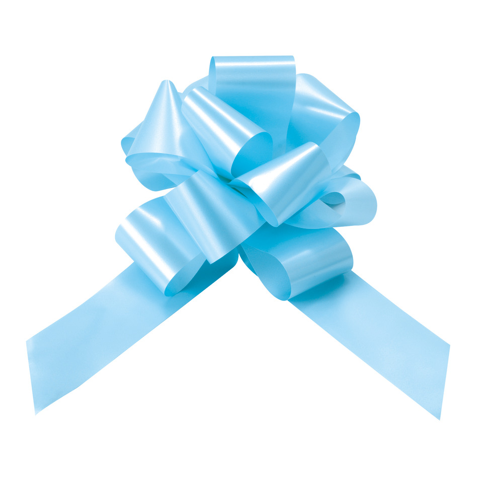Fiocco in nastro liscio da mm 48. Diametro fiocco 16 cm, colore azzurro. Confezione composta da 20 pezzi.