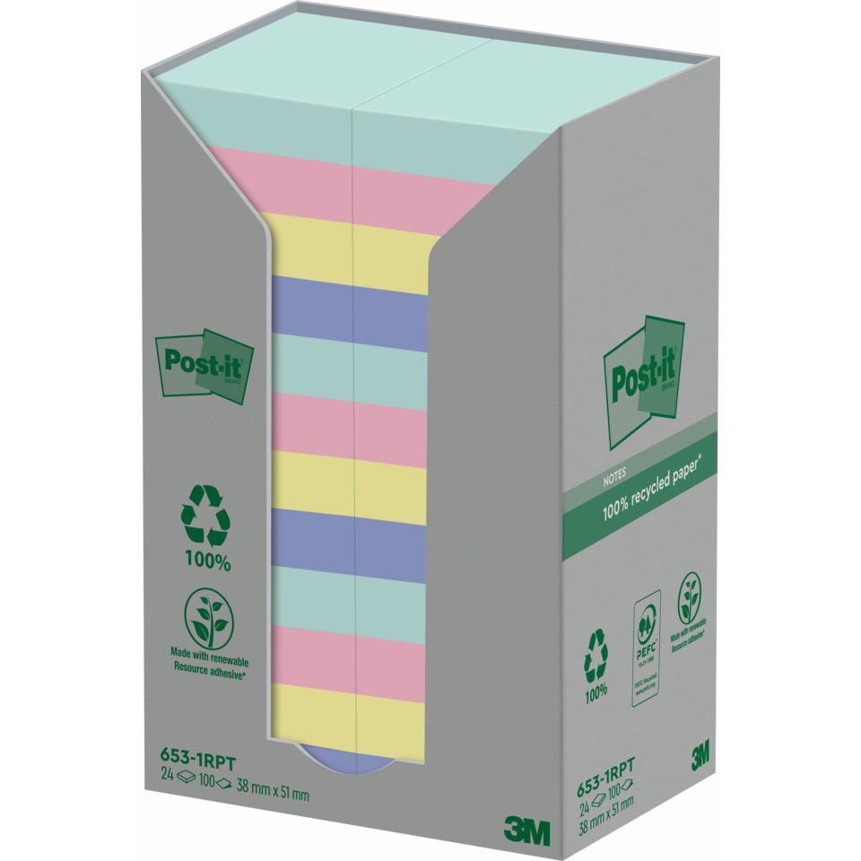 Foglietti Post-it® Notes in carta riciclata Assortito pastello – 38×51 mm (conf.24 blocchetti da 100 foglietti)