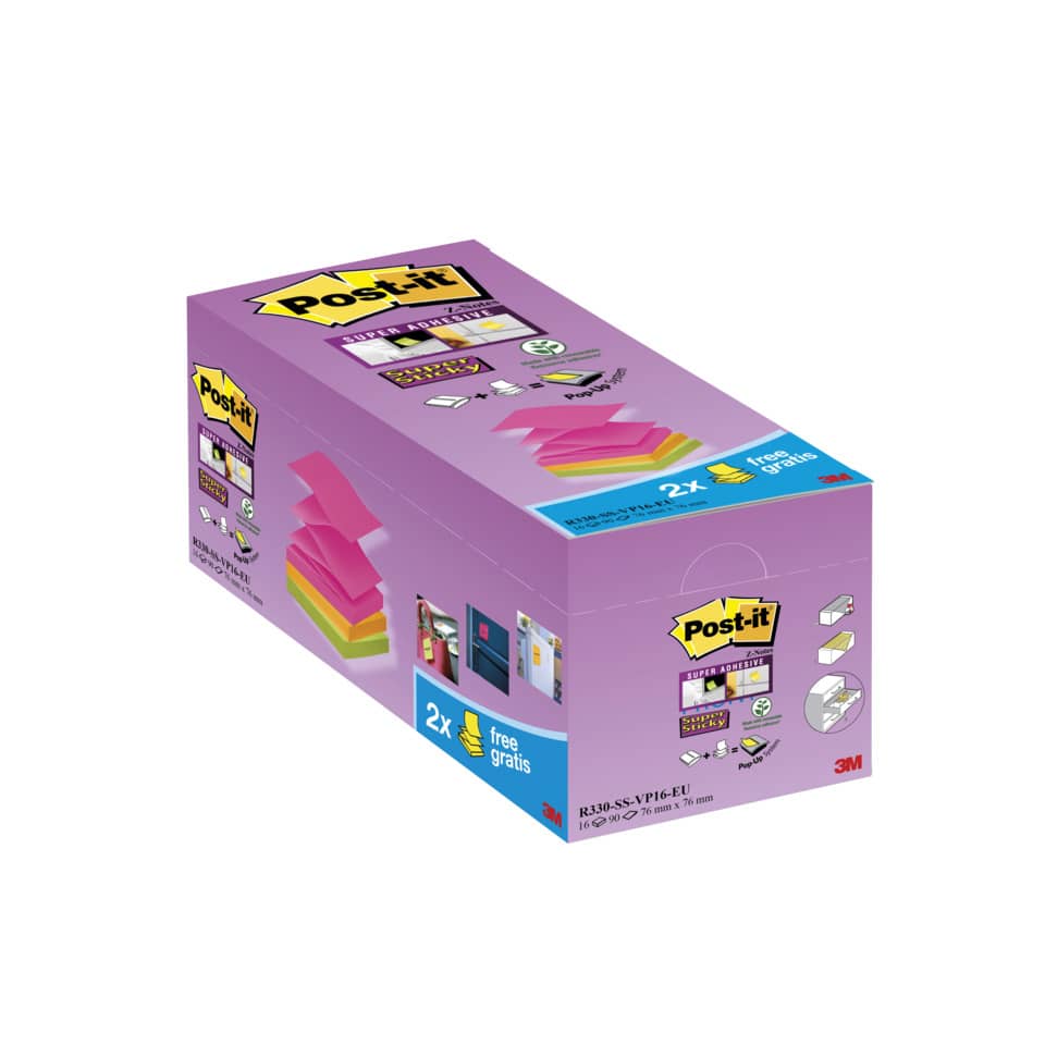 Ricariche foglietti Post-it® Super Sticky – Z-Notes – 76×76 mm (conf.16 blocchetti da 100 fogli Verde asparago, fucsia, Giallo curry)
