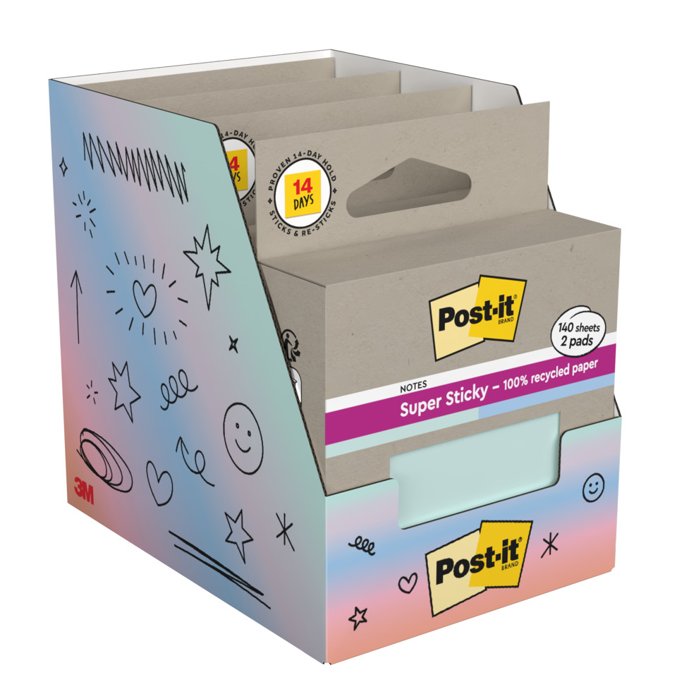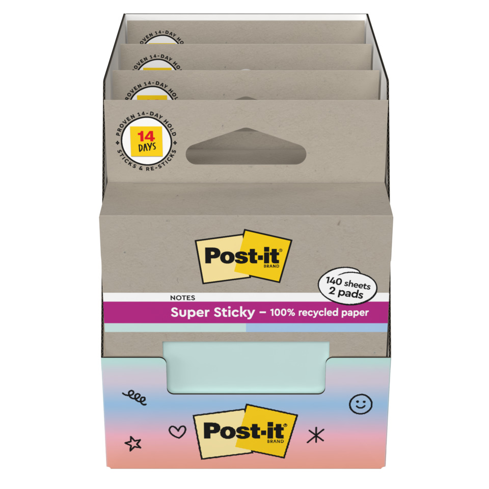 I Foglietti Post-it®Super Sticky Riciclati sono realizzati in carta riciclata al 100%, mentre la confezione è in cartone riciclato: entrambi sono riciclabili. Sono prodotti con carta PEFC proveniente da foreste certificate, rinnovabili e gestite responsabilmente. Dimensioni: 76 x 76 mm. Ideali per lasciare note o brevi messaggi in modo ecologico e responsabile per l'ambiente. Confezione composta da 2 blocchetti da 70 fogli ciascuno. Colori pastello menta e blu.