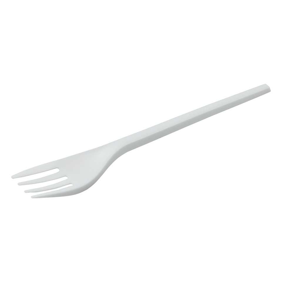 Forchetta in CPLA in busta biodegradabile e compostabile in PLA. Lunghezza: 171 mm. Peso: 3,7 grammi. Contenuto per confezione: 100 pezzi. Temperatura di esercizio: da -18 °C a +80 °C. Utilizzabile in freezer a basse temperature. Certificazioni: TUV INDUSTRIAL - DIN CERTCO. Prodotto PFAS free. Colore: bianco.