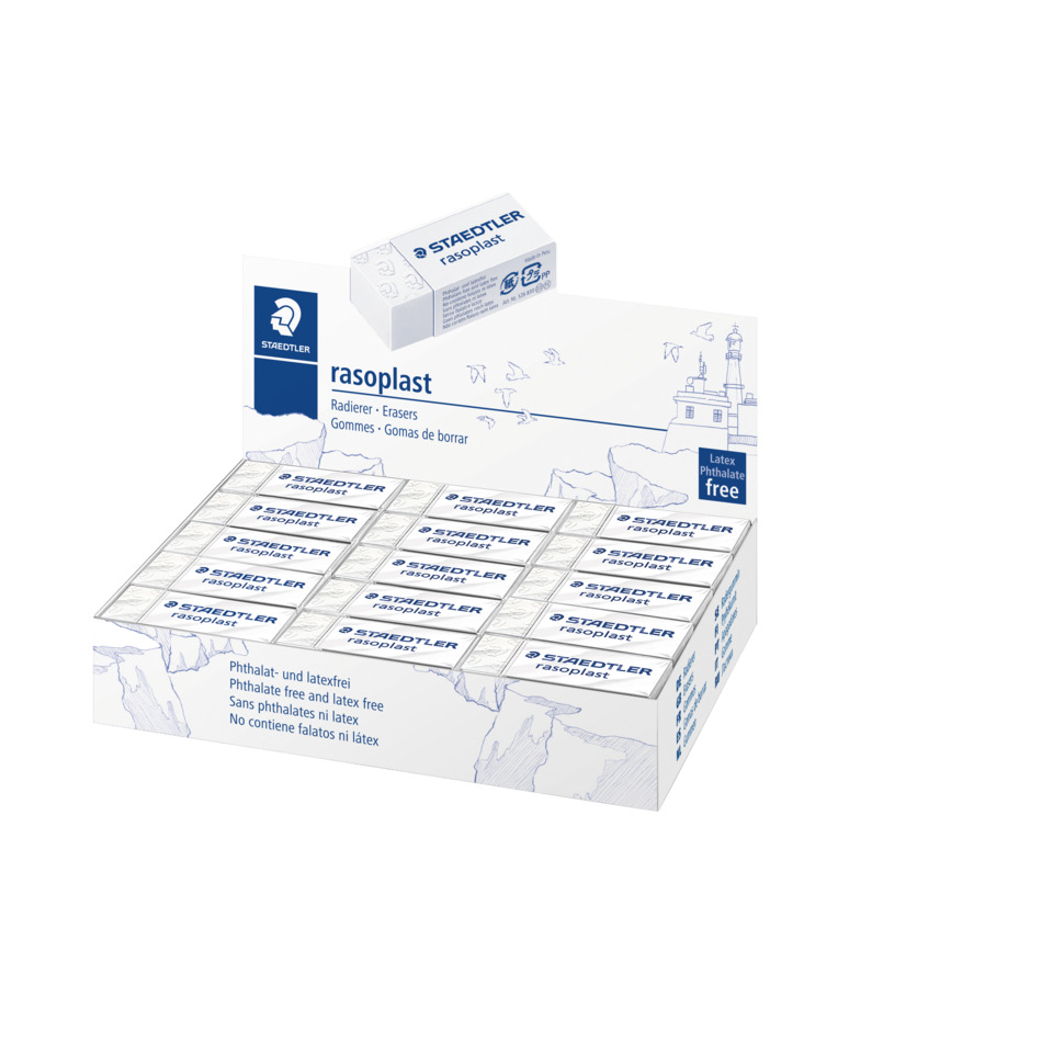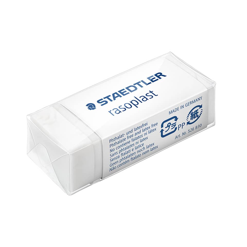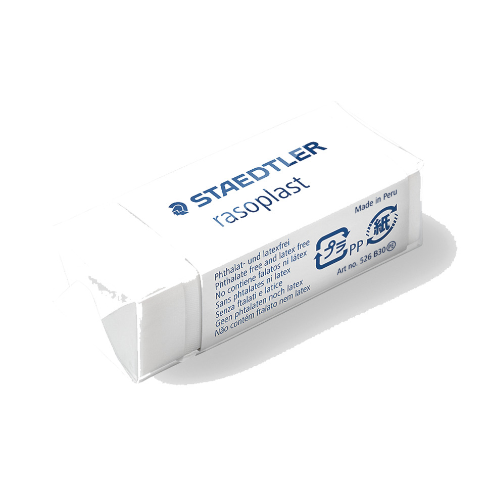 Gomme RASOPLAST 526 di alta qualità senza ftalati e senza latice. Gomma con pratico involucro di cellofan con apertura a strappo e fascetta scorrevole per un uso funzionale. Utile per grafite e inchiostro. Fascetta scorrevole in cartoncino. Dimensioni 43x19x13mm. Scatola da 30 pezzi.