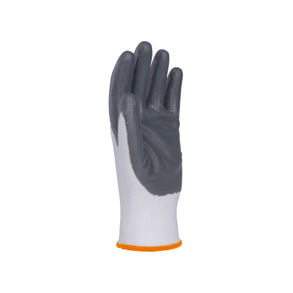Guanti realizzati in tessuto di poliestere a maglia di buona qualità di colore bianco, spalmati di nitrile grigio nella parte dell'impugnatura. Progettati per attività di assemblaggio, magazzino, meccanica, servizio, trasporto, costruzione, riparazione, attività industriali, agricole, di giardinaggio e hobbistiche. Spalmatura di nitrile grigio ad alta resistenza all'abrasione. Progettati per l'uso in ambienti asciutti e oleosi. Polsino elastico. I guanti sono anche protettivi contro i danni meccanici. Cat: II. Conformità alle norme EN 388:2016+A1:2018 (4131X), EN ISO 21420:2020. Materiali: poliestere/nitrile. Taglia: 9. Colore: bianco e grigio. Confezione composta da 12 paia.