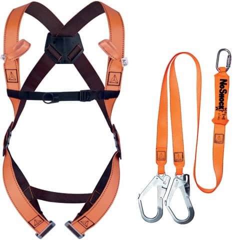 Kit anticaduta arancio pronto all'uso: imbracatura 2 punti di ancoraggio anticaduta (dorsale - sternale). 2 fibbie di regolazione. 2 placche laterali di regolazione (Rif. HAR12). Anticaduta ad assorbitore di energia con corda trefolata doppia (Y). 1 moschettone AM018 e 2 connettori AM022 (Rif. AN213200ZDD). Imbracatura anticaduta: Cinghia in poliestere. Corda ad assorbimento di energia: Cinghia in poliestere. Moschettone e gancio: Acciaio.