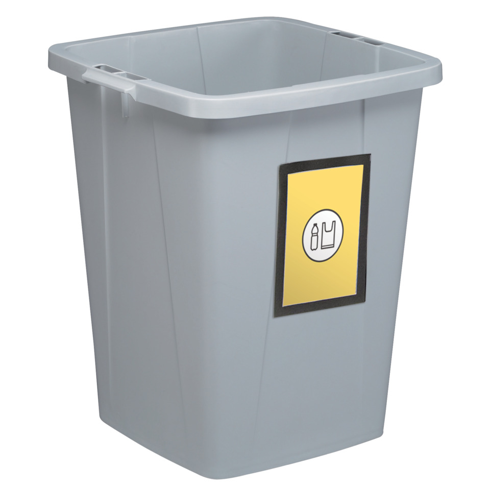 Kit composto da un contenitore portarifiuti DURABIN quadrato in PP da 90 litri con maniglie per agevolarne il trasporto. Adatto per la raccolta differenziata in tutti gli ambienti di lavoro in cui si necessita una grande capacità di stoccaggio. Lavabile e indeformabile fino a 120 °C e adatto anche allo stoccaggio di alimenti, in quanto conforme alla normativa europea 1935/2004/EC. Dimensioni: 520 x 490 x 610 mm (LxPxH). Senza coperchio. Il Kit include inoltre 2 cornici espositive adesive DURAFRAME® in formato A4 e di colore nero con pannello magnetico. Ideali per esporre avvisi e materiale informativo in modo professionale su superfici lisce e solide.