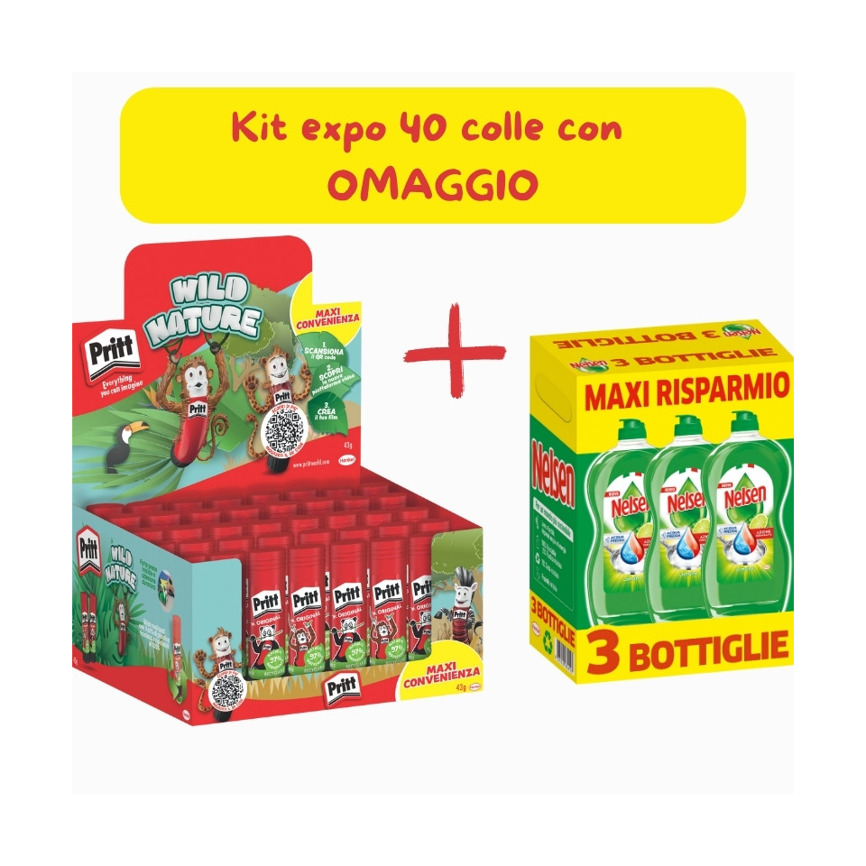 Kit composto da un espositore di 40 colle Pritt Stick da 43gr con in omaggio una confezione da 3 detersivi liquidi per piatti sgrassanti Nelsen da 850 ml al profumo di limone. Colla stick senza solventi ideale per incollare in modo rapido carta, cartoncino e foto. Collaggio con forte tenuta, presa immediata e a lunga durata. Il materiale colloso è realizzato per il 97% con materie prime rinnovabili, acqua inclusa. Confezione con plastica riciclata fino al 65%. Contenuto nel dettaglio: 4 scomparti da 10 colle in stick ciascuno.
