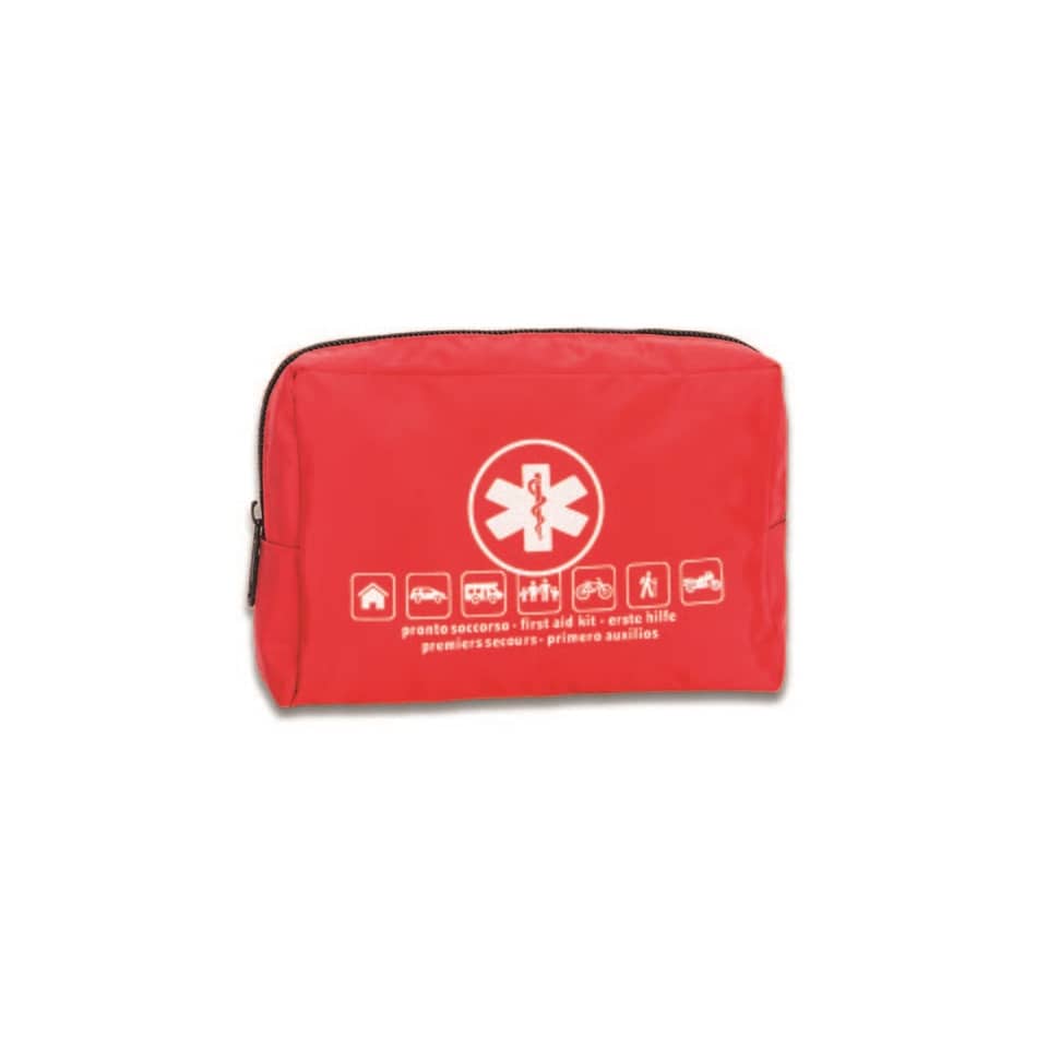 Kit primo soccorso da auto Pharma Shield - 15x13x5 cm. Borsetta pronto soccorso in nylon, colore rosso, doppia cerniera.