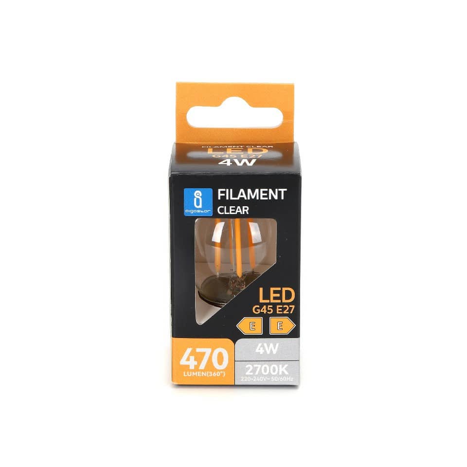 Lampadina a filamento LED G45. Vita utile 25.000 ore. Può essere ampiamente usato in varie scene casa o in ufficio, ecc. Facile da installare. Potenza 4W. Temperatura di colore 2700K. Flusso luminoso 470 lumen. Voltaggio 220-240V'. DF '0,5. Intensità corrente 33mA. Frequenza 50/60Hz. Angolo di illuminazione 330°. Adattatori per lampadine E27. Luce calda. Dimensioni ø45 x H. 73 mm. Utilizzo in ambienti interni. Certificazione CE.
