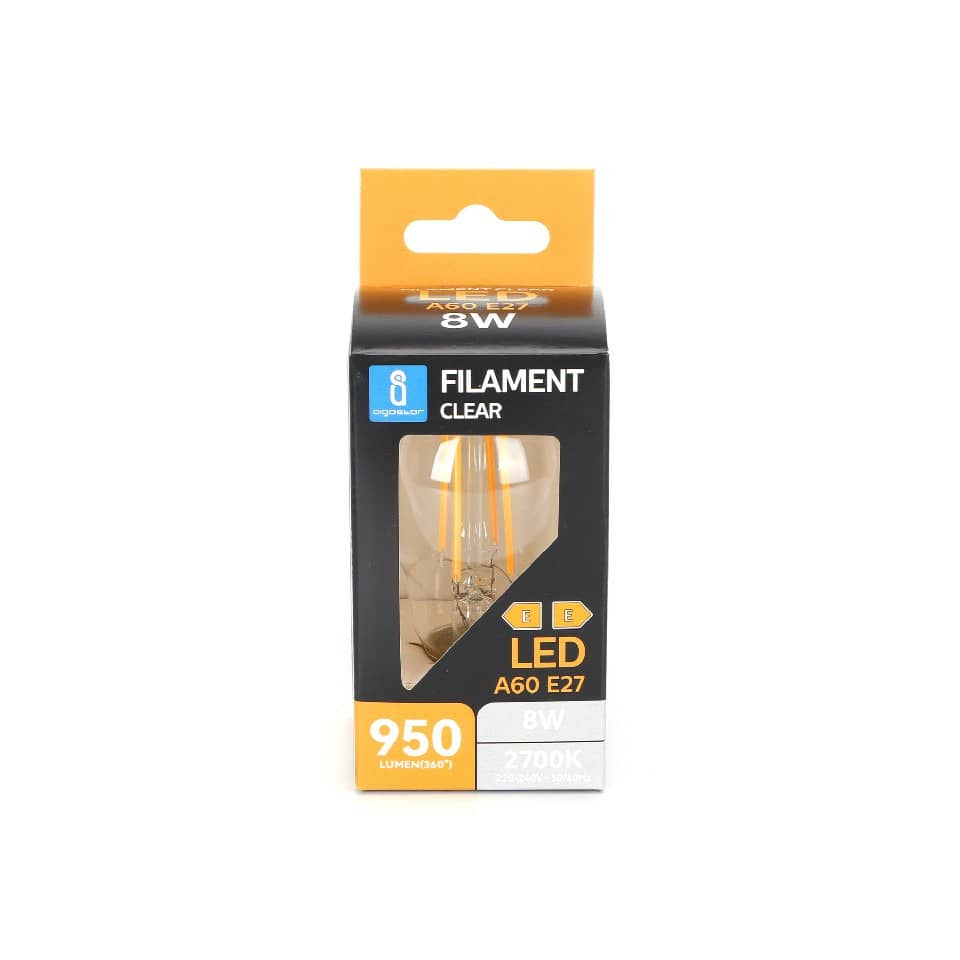 Lampadina a filamento LED A60. Vita utile 25.000 ore. Può essere ampiamente usato in varie scene casa o in ufficio, ecc. Facile da installare. Potenza 8W. Temperatura di colore 2700K. Flusso luminoso 950 lumen. Voltaggio 220-240V'. DF '0,5. Intensità corrente 42mA. Frequenza 50/60Hz. Angolo di illuminazione 330°. Adattatori per lampadine E27. Luce calda. Dimensioni ø60 x H. 105 mm. Utilizzo in ambienti interni. Certificazione CE.