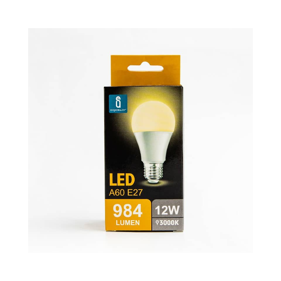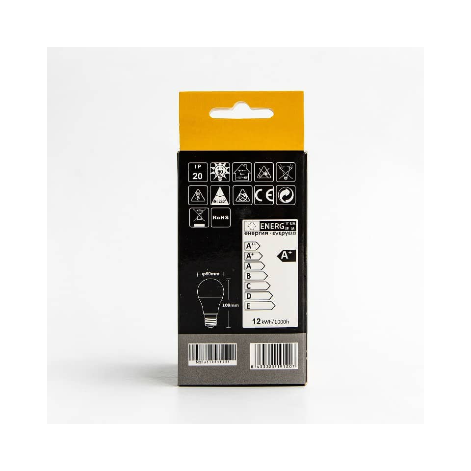 Lampadina LED A60 E27 12W. Vita utile 15.000 ore. Può essere ampiamente usato in varie scene casa o in ufficio, ecc. Facile da installare. Potenza 12W. Temperatura di colore 3000K. Flusso luminoso 1170 lumen. Voltaggio 220-240V'. DF '0,5. Intensità corrente 70mA. Frequenza 50/60Hz. Angolo di illuminazione 190°. Adattatori per lampadine E27. Luce calda. Utilizzo in ambienti interni. Certificazione CE.
