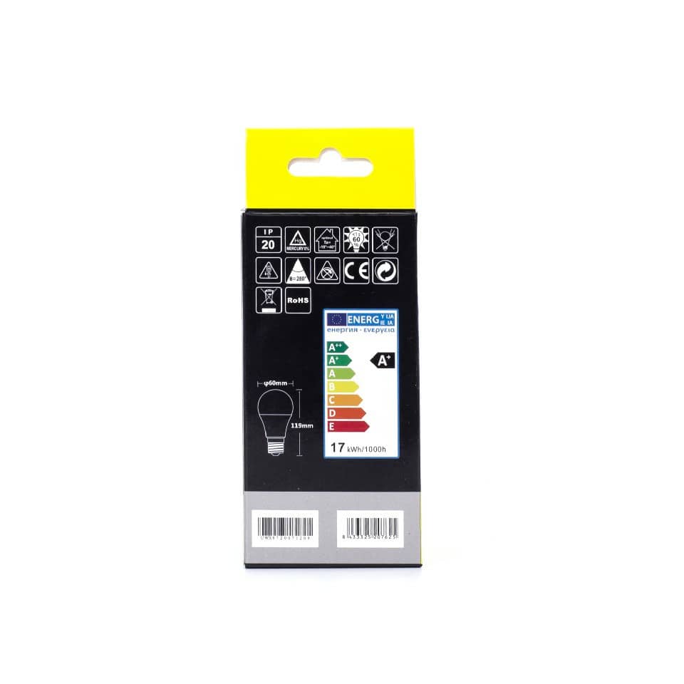 Lampadina LED A60 E27 17W. Vita utile 15.000 ore. Può essere ampiamente usato in varie scene casa o in ufficio, ecc. Facile da installare. Potenza 17W. Temperatura di colore 4000K. Flusso luminoso 1360 lumen. Voltaggio 220-240V'. DF '0,5. Intensità corrente 130mA. Frequenza 50/60Hz. Angolo di illuminazione 190°. Adattatori per lampadine E27. Luce naturale. Utilizzo in ambienti interni. Certificazione CE.
