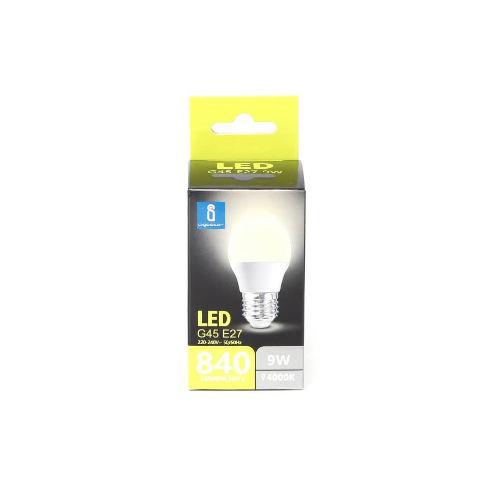 Lampadina LED G45 E27 9W. Vita utile 15.000 ore. Può essere ampiamente usato in varie scene casa o in ufficio, ecc. Facile da installare. Potenza 9W. Temperatura di colore 4000K. Flusso luminoso 840 lumen. Voltaggio 220-240V'. DF '0,5. Intensità corrente 75mA. Frequenza 50/60Hz. Angolo di illuminazione 175°. Adattatori per lampadine E27. Luce naturale. Utilizzo in ambienti interni. Certificazione CE.