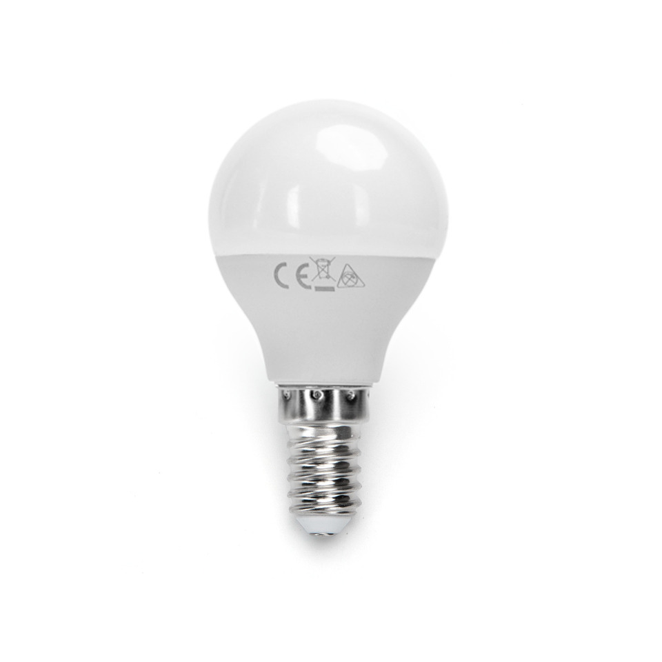 Lampadine LED G45 E14 6 W. Flusso luminoso: 510 lm. Temperatura di colore: 3000K. Colore della luce: calda. Voltaggio:220-240 V~. Dimensioni: D.45 x H.80 mm. Uso interno. Vita utile: 15.000 h. Confezione da 5 pezzi.