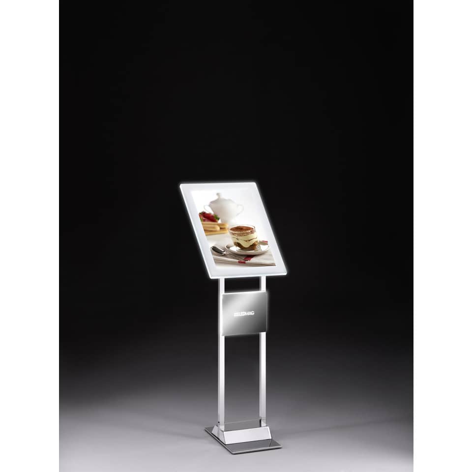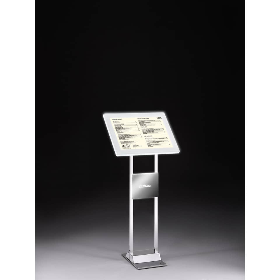 Comodo e pratico leggio da interno con cornice magnetica LEDMAG retroilluminata a LED formato A3 35x47 cm. Ruotabile in orizzontale e verticale. Piantana in acciaio metallizzato, alimentatore interno da 40w. Ideale per ristoranti, sale riunioni, agenzie, pazi espositivi in genere. Dimensioni: 25x40x120 cm. Peso netto: 10 Kg. Peso Lordo: 12 Kg.