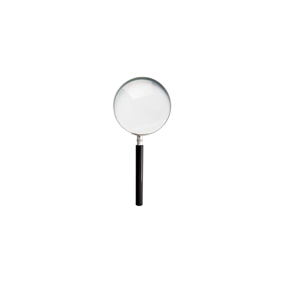 Lente d'ingrandimento realizzata con lente in cristallo, bordo in metallo e manico in plastica nera lucida. Offre un ingrandimento nitido e preciso. Ideale per leggere testi piccoli o osservare dettagli. Diametro 100 millimetri.