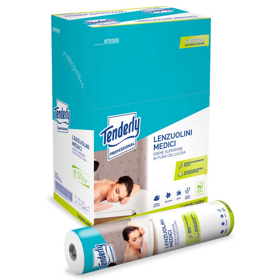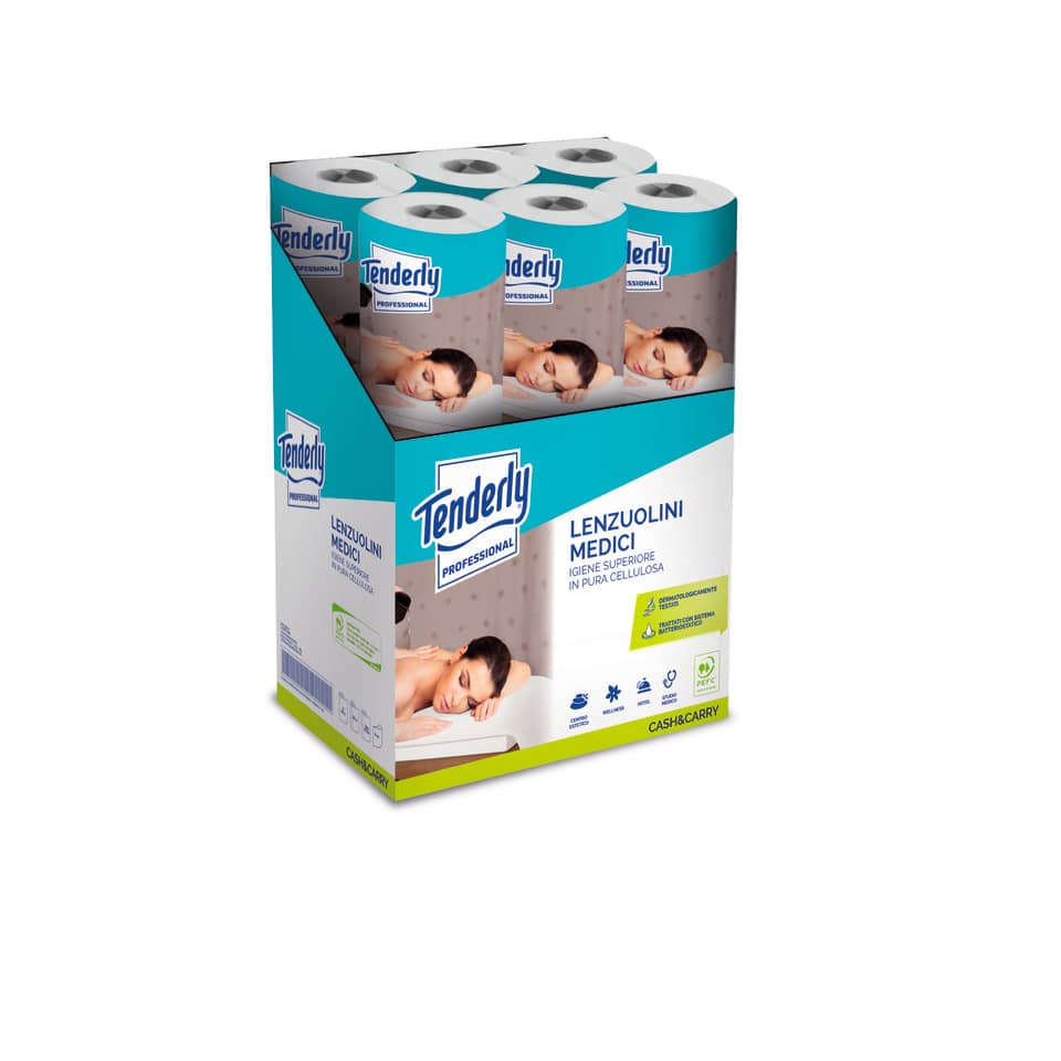 Lenzuolino medico in pura cellulosa a due veli, trattato con sistema batteriostatico. Certificato PEFC. Larghezza 59 cm, lunghezza 80 m, diametro rotolo 14,5 cm. Diametro anima 4,5 cm.