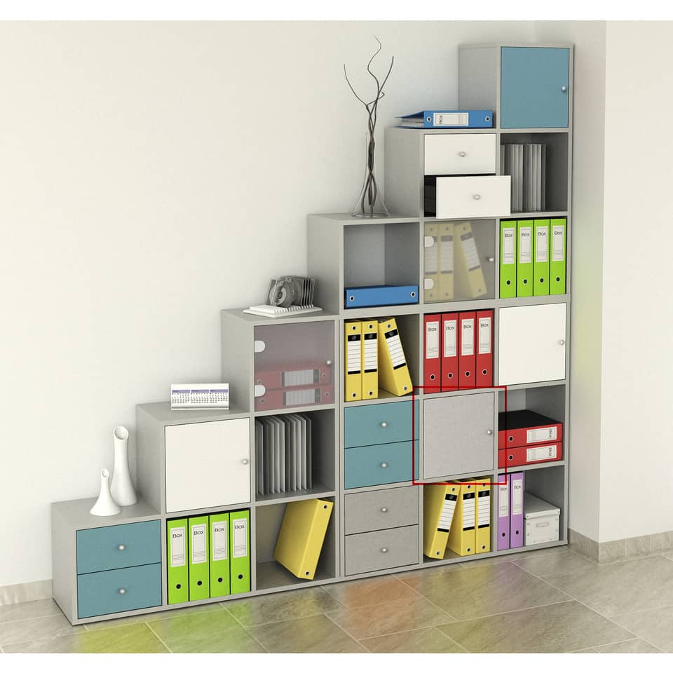 Coppia antine per libreria, cm 32,2 x 32,1h, grigio alluminio.Realizzate in melaminico bilaminato antigraffio e antiriflesso (sp.16 mm) conforme alle norme UNI e EN classe E1. Componibiliper sovrapposizione e affiancamento. Le librerie hanno entrambii bordi dello stesso colore della struttura. Antine disponibilianche in vetro temperato satinato sp. 4 mm. Ogni casella misuracm 32,5 x 32,5 h. La profondità utile è di 29 cm. Antina e cassettidotati di pratico pomello. La coppia di cassetti è completa didietrino in colore. Indicate per l’archiviazione di raccoglitoriformato commerciale, altezza max cm 32,5.Le librerie sono reversibili e gli accessori possono essere montatida entrambi i lati.