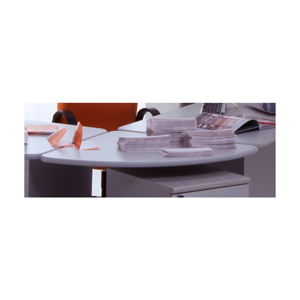 La possibilità di posizionare a piacere i raccordi ad angolo con le scrivanie, lascia ampio spazio alla realizzazione di banchi multipli ed articolati. Piano realizzato in nobilitato melaminico con piano di spessore 25 mm, bordato pvc 180°.