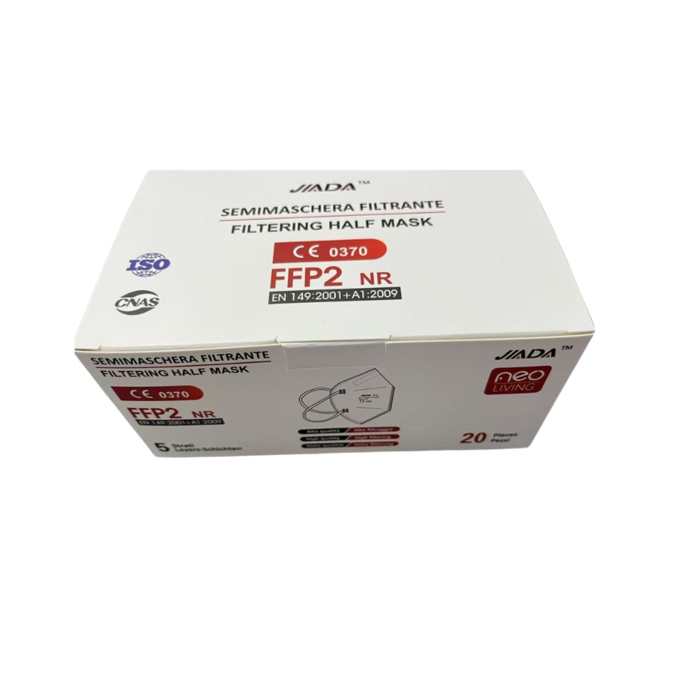 Mascherine FFP2 a 5 strati. Mascherine ad alta filtrazione, monouso e non sterili. CE 0370 NR EN149:2001+AI:2009 - PFE +99%. Scadenza Giugno 2030. Confezione composta da 20 mascherine imbustate singolarmente.