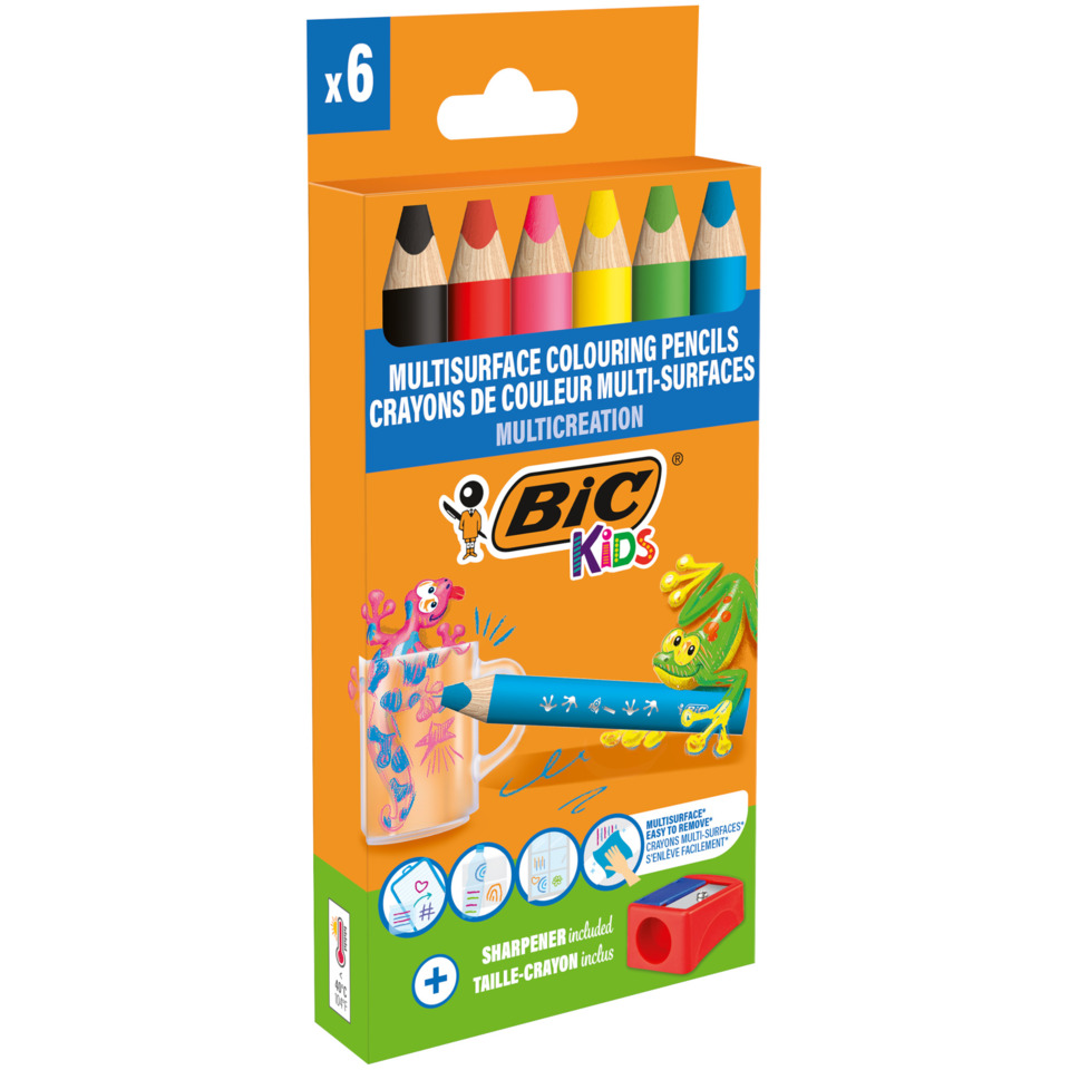 Matite colorate multisuperficie BIC Kids Multisurface con confortevole forma triangolare per una facile impugnatura. Permettono di scrivere, disegnare e colorare su svariate superfici e possono essere utilizzate come matite colorate, pastelli a cera e matite acquerellabili. Sono facili da rimuovere da superfici non porose, pelle e dalla maggior parte dei tessuti. Confezione composta da 6 colori con temperamatite incluso.