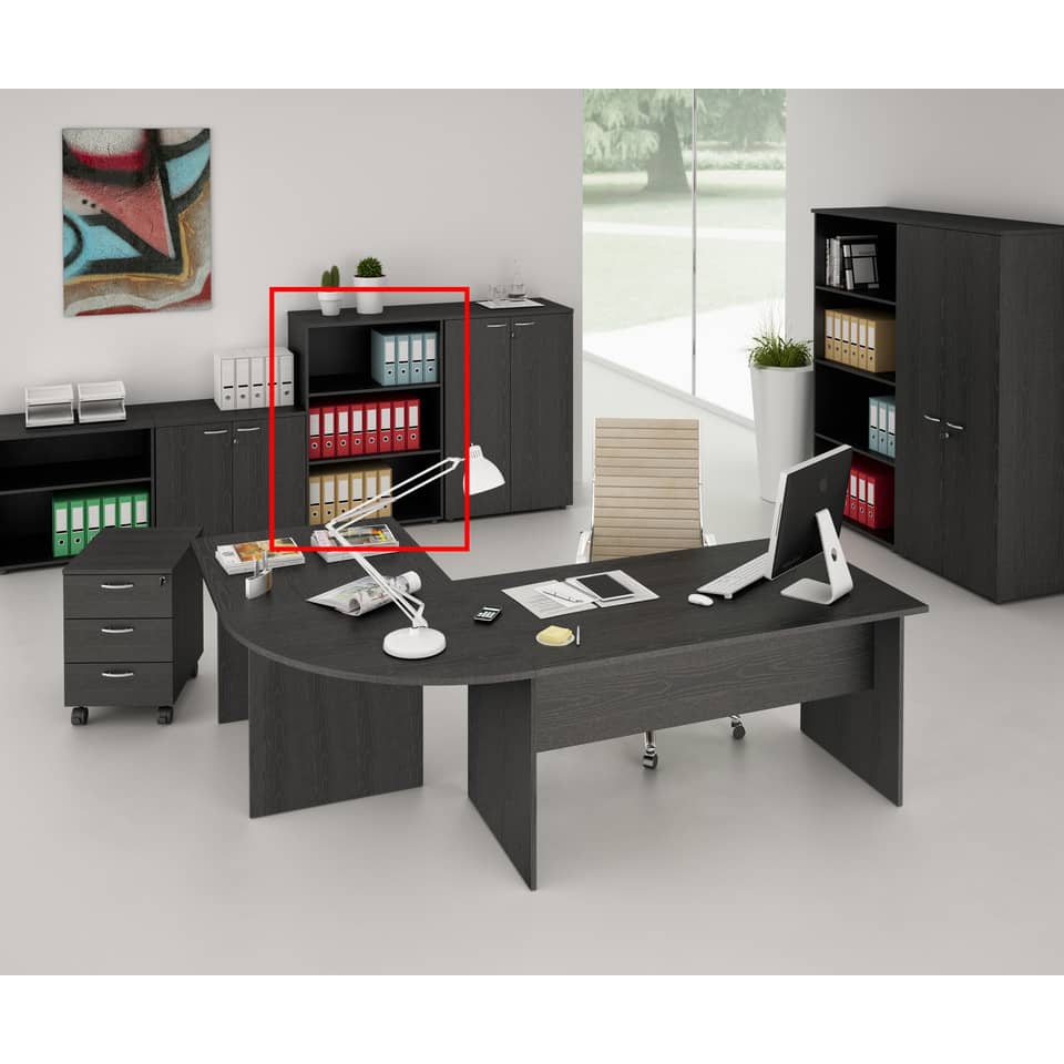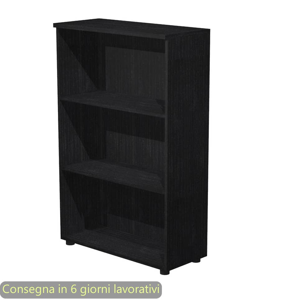 Mobile medio a giorno cm 80 x 35 x 120 h, 2 ripiani regolabili, nero venato frassino. Disponibili in tre altezze a due profondità, a giorno o completabili con ante complete di serratura. Top sp. 22 mm, struttura sp. 18 mm, ripianiriposizionabili sp. 18 mm, ante sp. 18 mm. Rifiniti posteriormente nello stesso colore della struttura possono essere utilizzati come pareti divisorie. Piedini regolabili in altezza per un perfetto livellamento sul pavimento. Ripiani dei mobili regolabili in altezza con sistema di bloccaggio nella posizione desiderata.