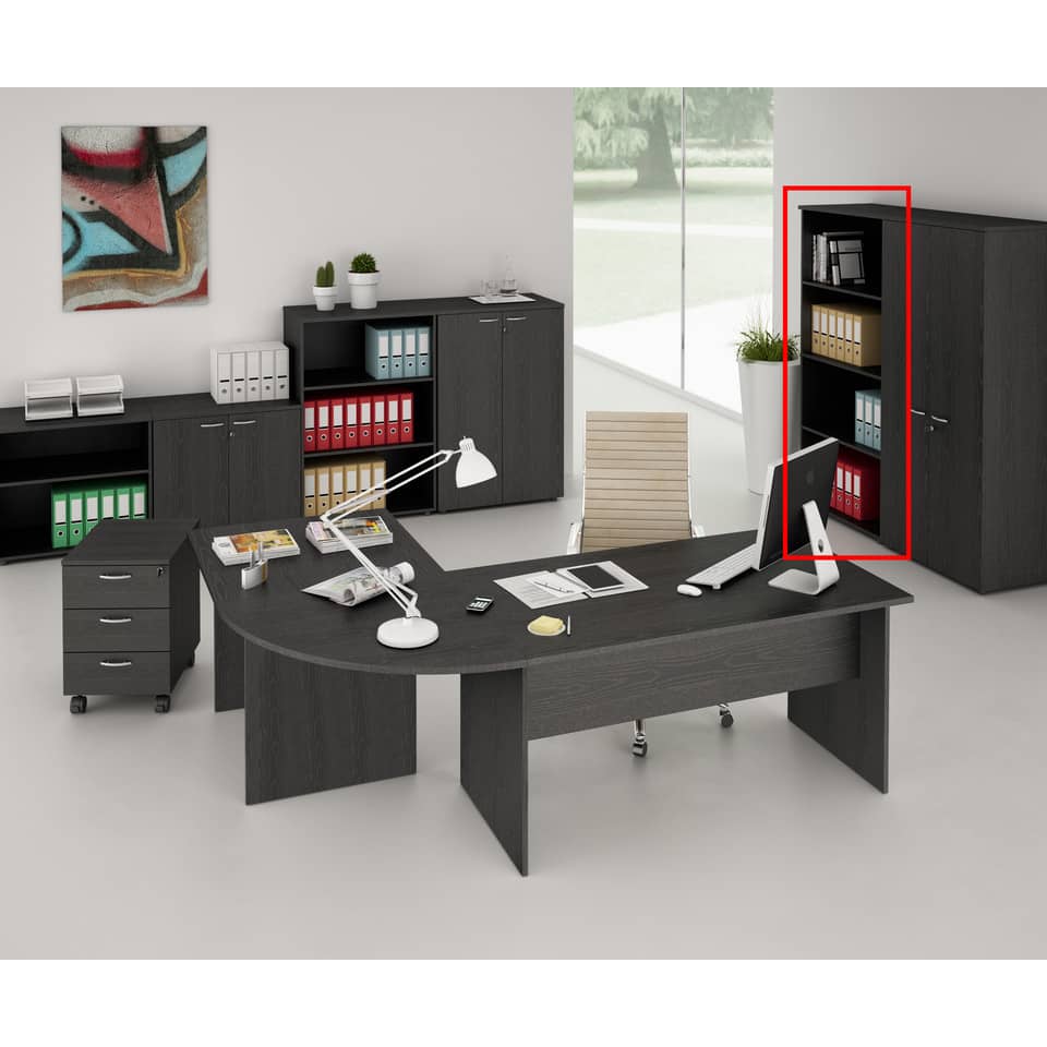 Mobile alto a giorno cm 80 x 35 x 180 h, 3 ripiani regolabili, nero venato frassino.Disponibili in tre altezze a due profondità, a giorno o completabili con ante complete di serratura. Top sp. 22 mm, struttura sp. 18 mm, ripianiriposizionabili sp. 18 mm, ante sp. 18 mm. Rifiniti posteriormente nello stesso colore della struttura possono essere utilizzati come pareti divisorie. Piedini regolabili in altezza per un perfetto livellamento sul pavimento. Ripiani dei mobili regolabili in altezza con sistema di bloccaggio nella posizione desiderata.