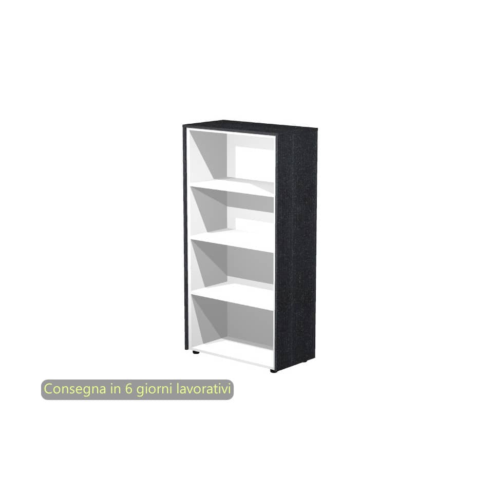 Mobile medio-alto a giorno completo di top e fianchi finitura. 3 ripiani (sp. 25 mm) regolabili in altezza. Rifinito sul retro (sp. 10 mm), può essere posizionato a centro stanza come elemento divisorio. Piedini livellabili. Struttura (sp. 18 mm) colore grigio alluminio, top e fianchi finitura (sp. 14 mm) colore nero venato. Dimensioni in cm: L83 P43 H158,2.