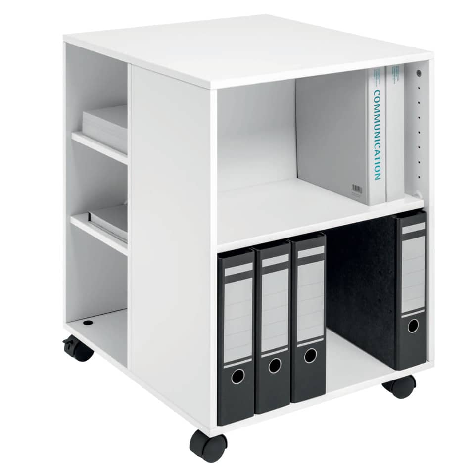 Mobile multifunzione versatile ideale per riporre dispositivi elettronici e attrezzatura da ufficio. Facile da spostare e sicuro nel movimento (dotato di 4 ruote pivotanti, di cui 2 provviste di dispositivo di bloccaggio). N°6 ripiani robusti (16 mm) per raccoglitori, carta o attrezzatura da ufficio, ecc. Aperto su 3 lati per un facile accesso. Facile da assemblare grazie alle istruzioni di montaggio incluse. Ogni ripiano può supportare max. 25 kg. Capacità di carico totale 60 kg. Profondità esterna: 528mm. Altezza esterna: 748 mm. Larghezza esterna: 592 mm.
