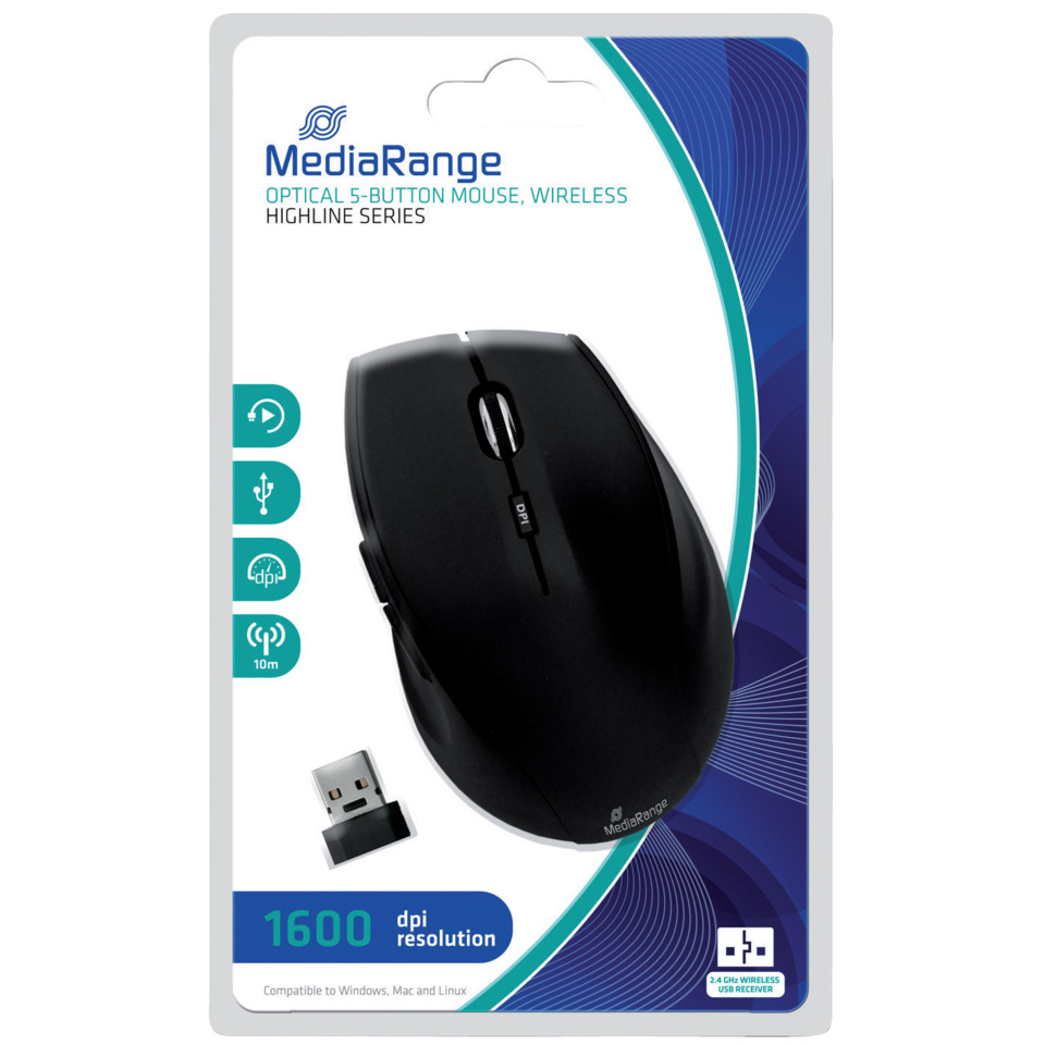 Mouse ottico Media Range 5 pulsanti, serie highline, wireless 1600 dpi Nero MROS208